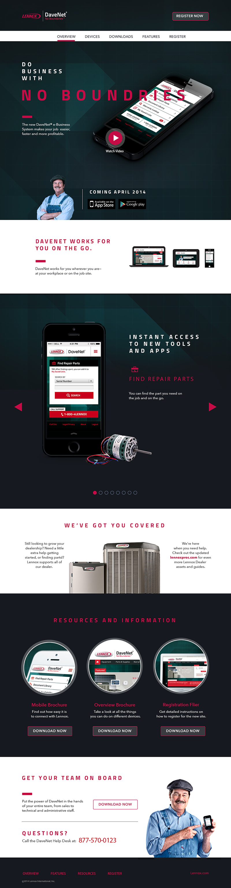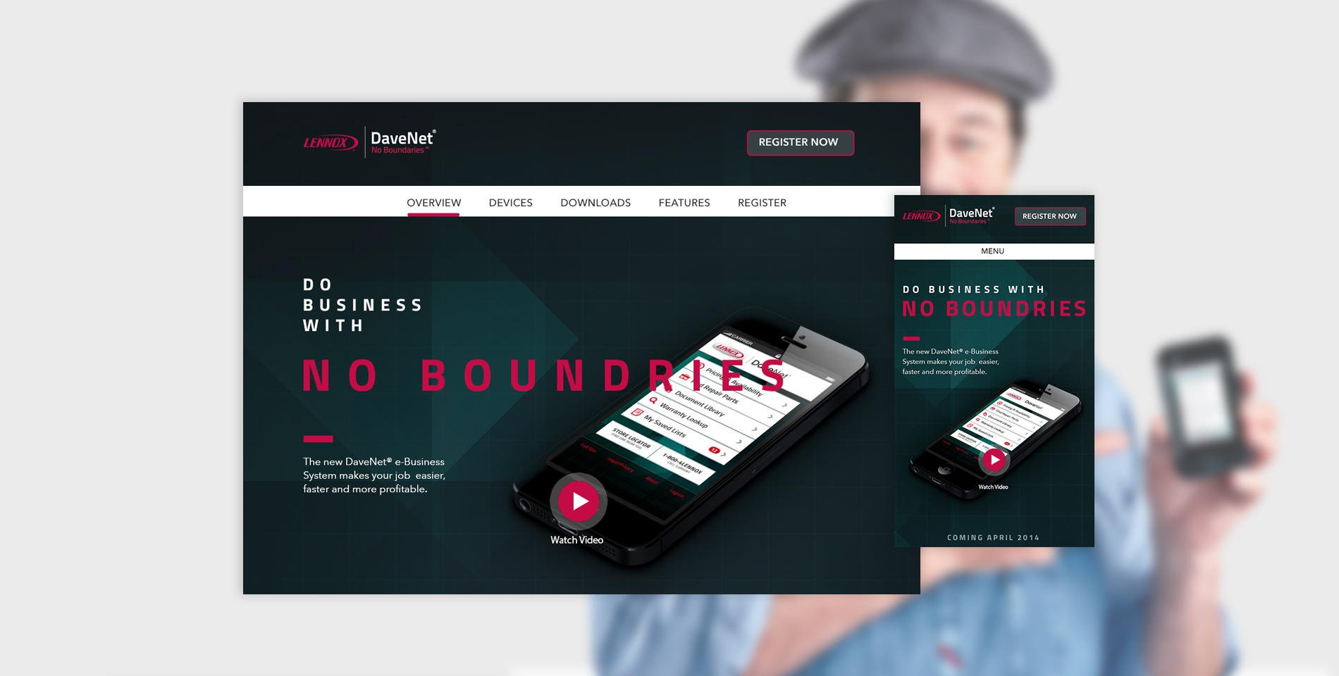Lennox needed a way to get the word out to dealers about their new all-in-one website, DaveNet. DaveNet is where dealers go to find all the information they need to get the job done. A landing page was a simple and elegant solution. The clients website had not been updated, so to work outside of the previous framework, we designed a landing page that was also responsive. Desktop Mobile